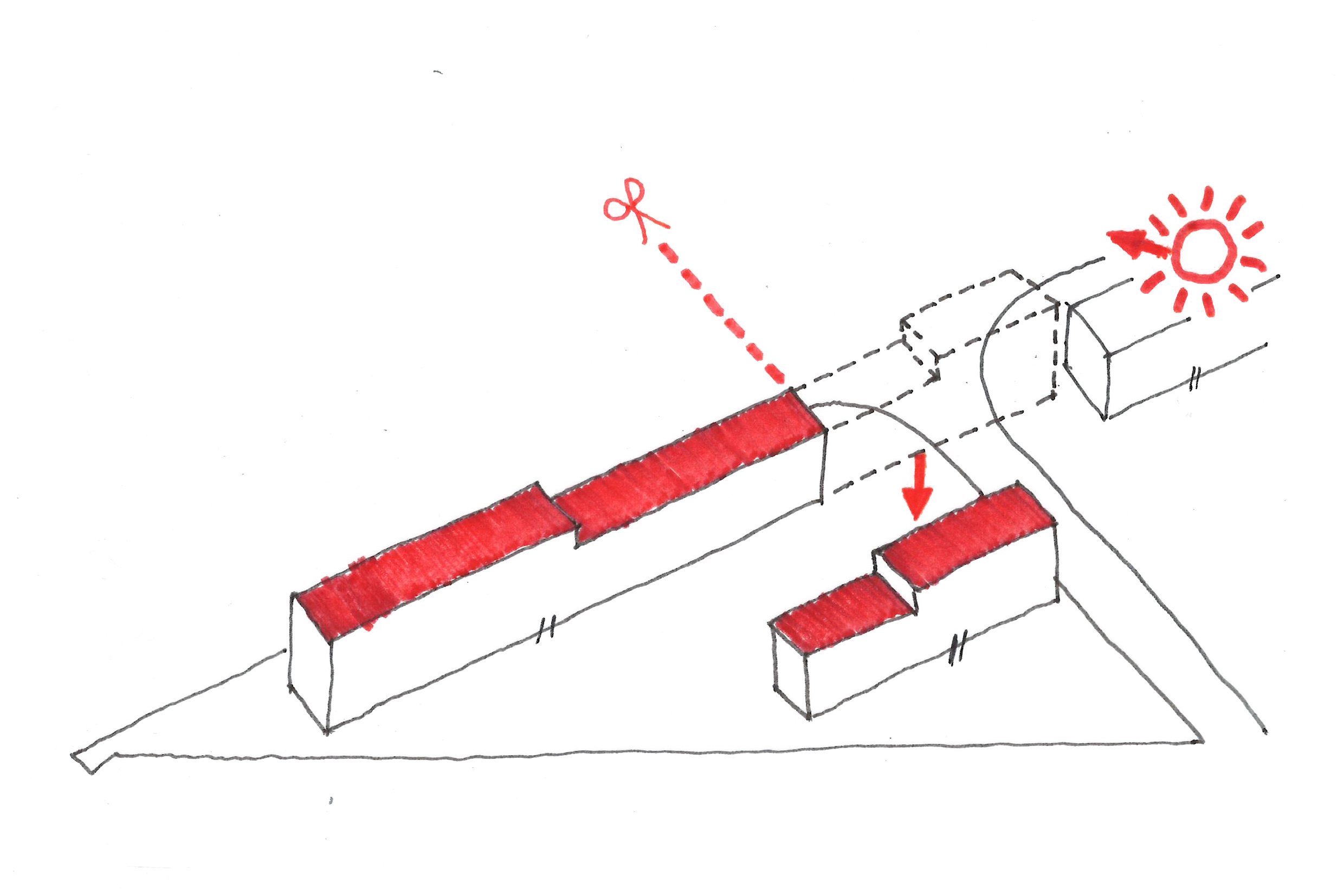 6.VNÚTROBLOK ako poloverejný priestor. Vytvorením polozapusteného suterénu pre parkovanie nám vzniká vo vnútrobloku zvýšené plató komunikujúce s okolím miernym bezbariérovým svahom. Vytvára sa poloverejný priestor s kaviarňou, službami, zeleňou, oddychovou zónou, s detským ihriskom; ktorý prirodzene komunikuje medzi blízkym okolím a novými budovami. Polozapusteným suterénom sa zabezpečí intimita bytov na zvýšenom prízemí.