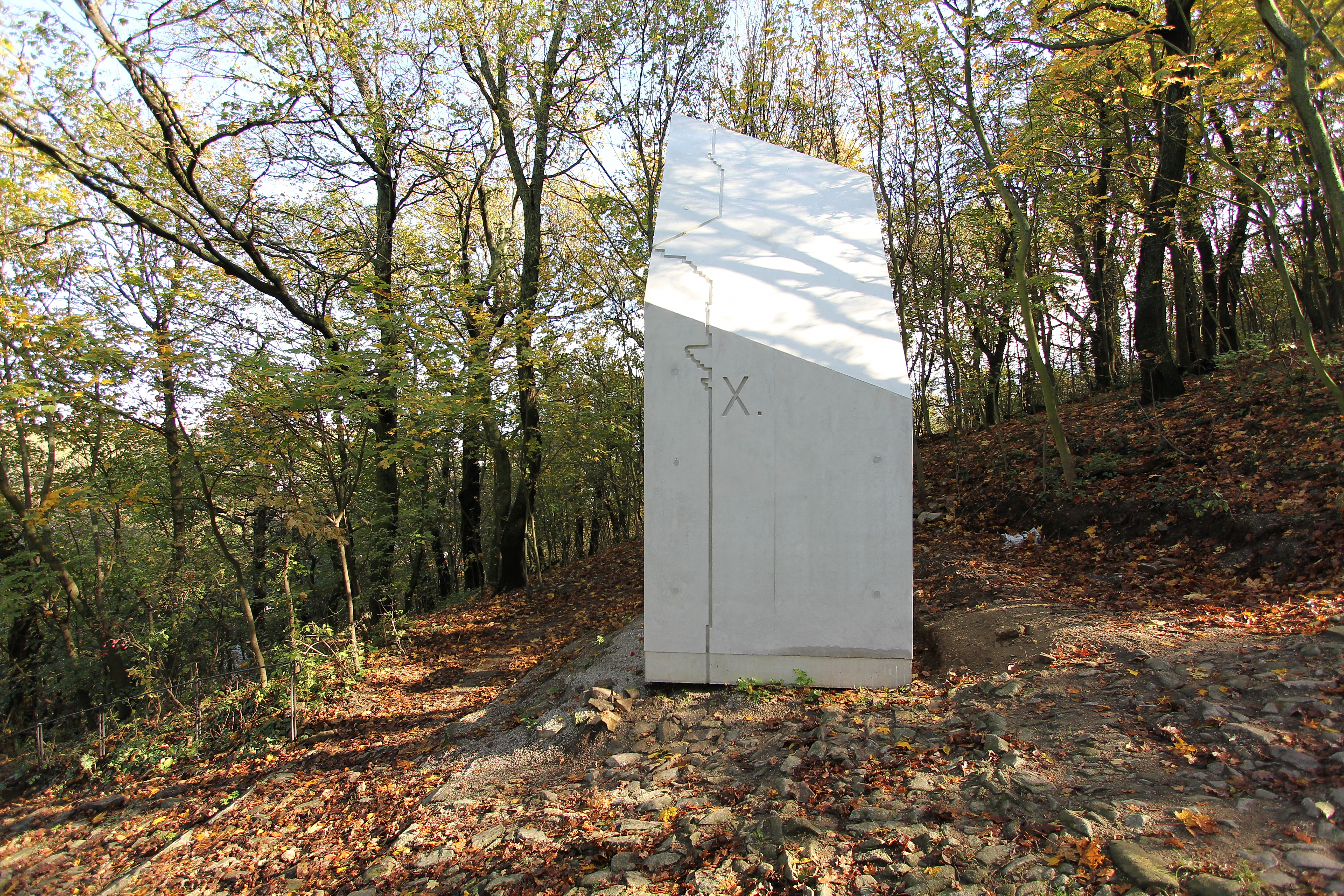 Materiál - ušľachtilý betón, pevný blok, ktorý nik neodnesie , nerozoberie, materiál spracovaný súčasnými technológiami – hladký pohľadový biely betón , blok s odtlačkom pôvodného profilovania ako otlačok minulosti