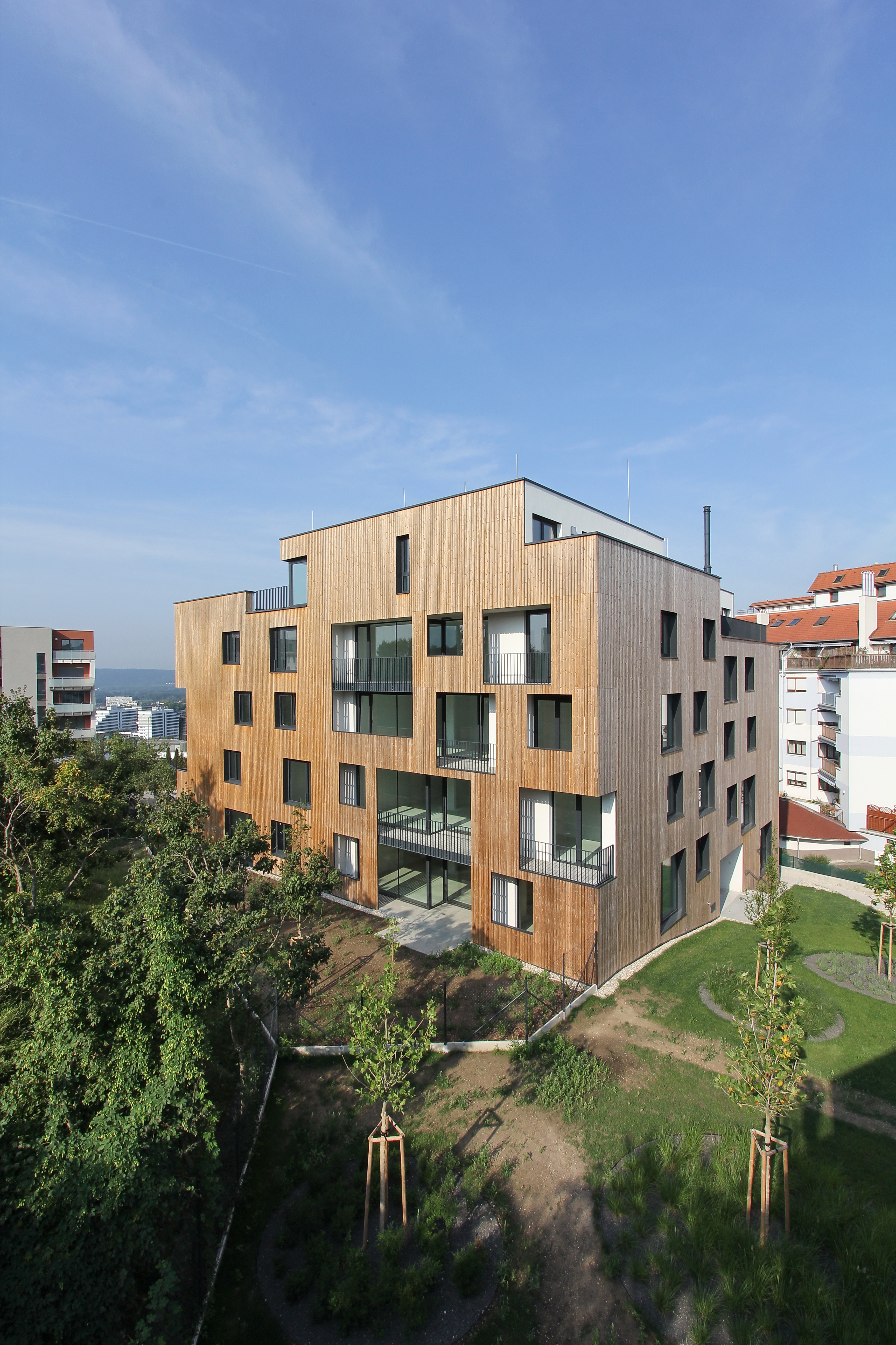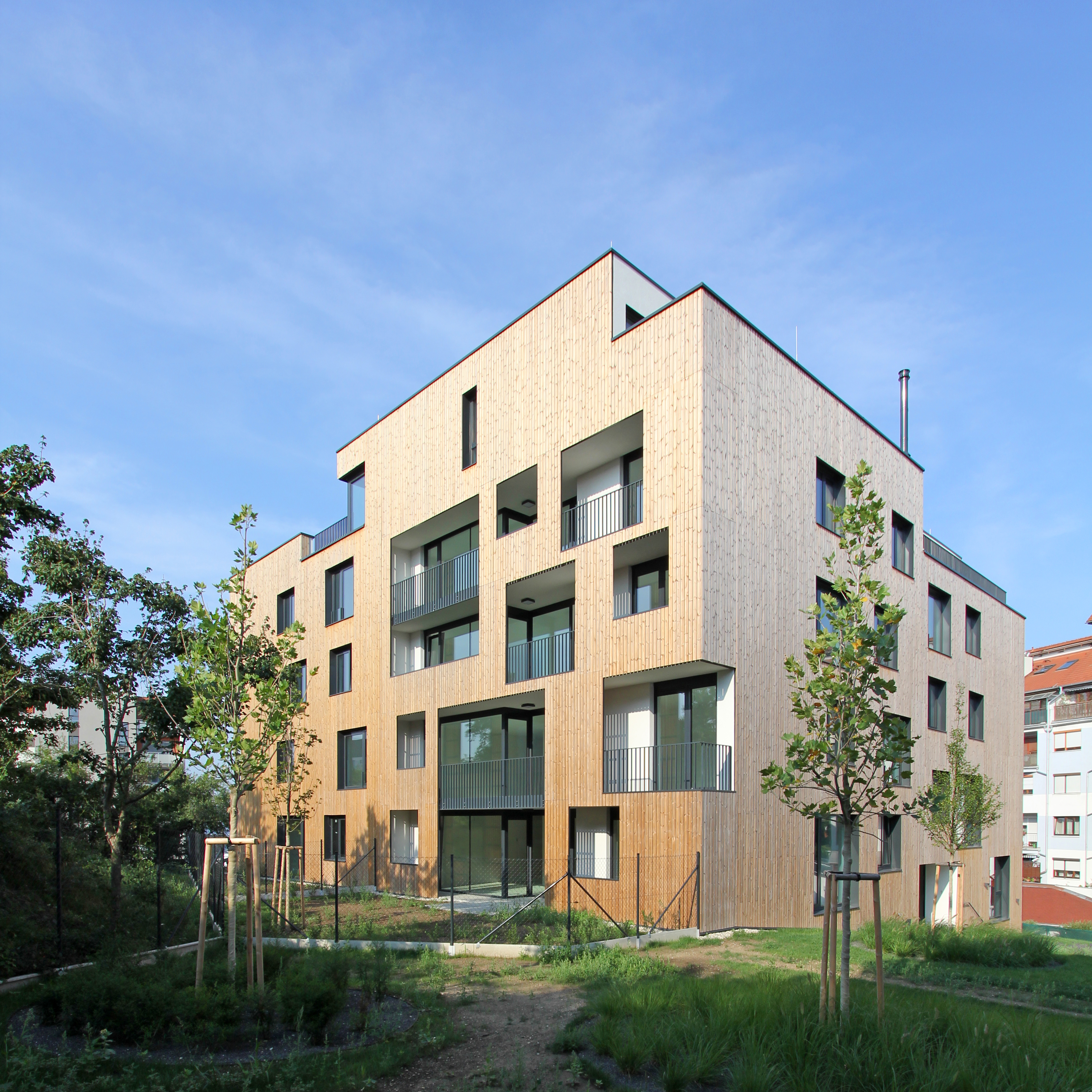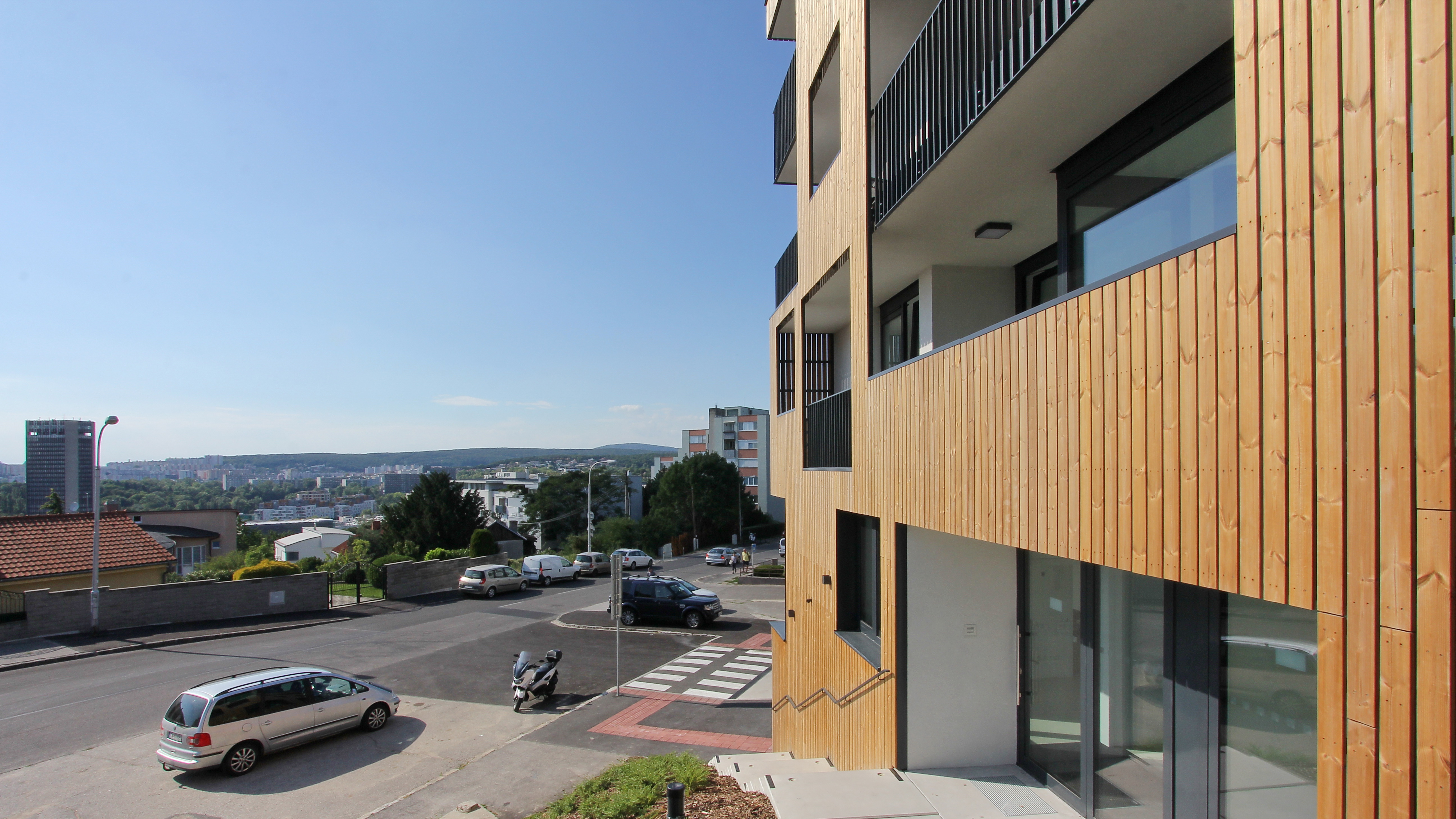Primárnym konceptom bolo vytvoriť mierku budovy, ktorá zapadne do zložitého urbanistického prostredia. Tento prechod medzi objemami okolitých budov sa docielil „optickou ilúziou mierky budovy“ a to jej pôdorysným natočením, jej prispôsobením sa tektonike jestvujúceho terénu a v neposlednom rade striedaním rôznych veľkostí otvorov na fasáde. Sekundárnym konceptom bolo vytvoriť kompaktnú hmotu objektu, v ktorej sa zjednotí fasáda stien, balkónov a loggií pri zachovaní striedania rôznych veľkostí otvorov na fasáde. K tomuto sa zdalo ako najvhodnejší materiál použiť drevenú latu, ktorá môže zároveň tvoriť kryt prevetrávaného obkladu steny, alebo transparentnú stenu, či zábradlie balkónu.