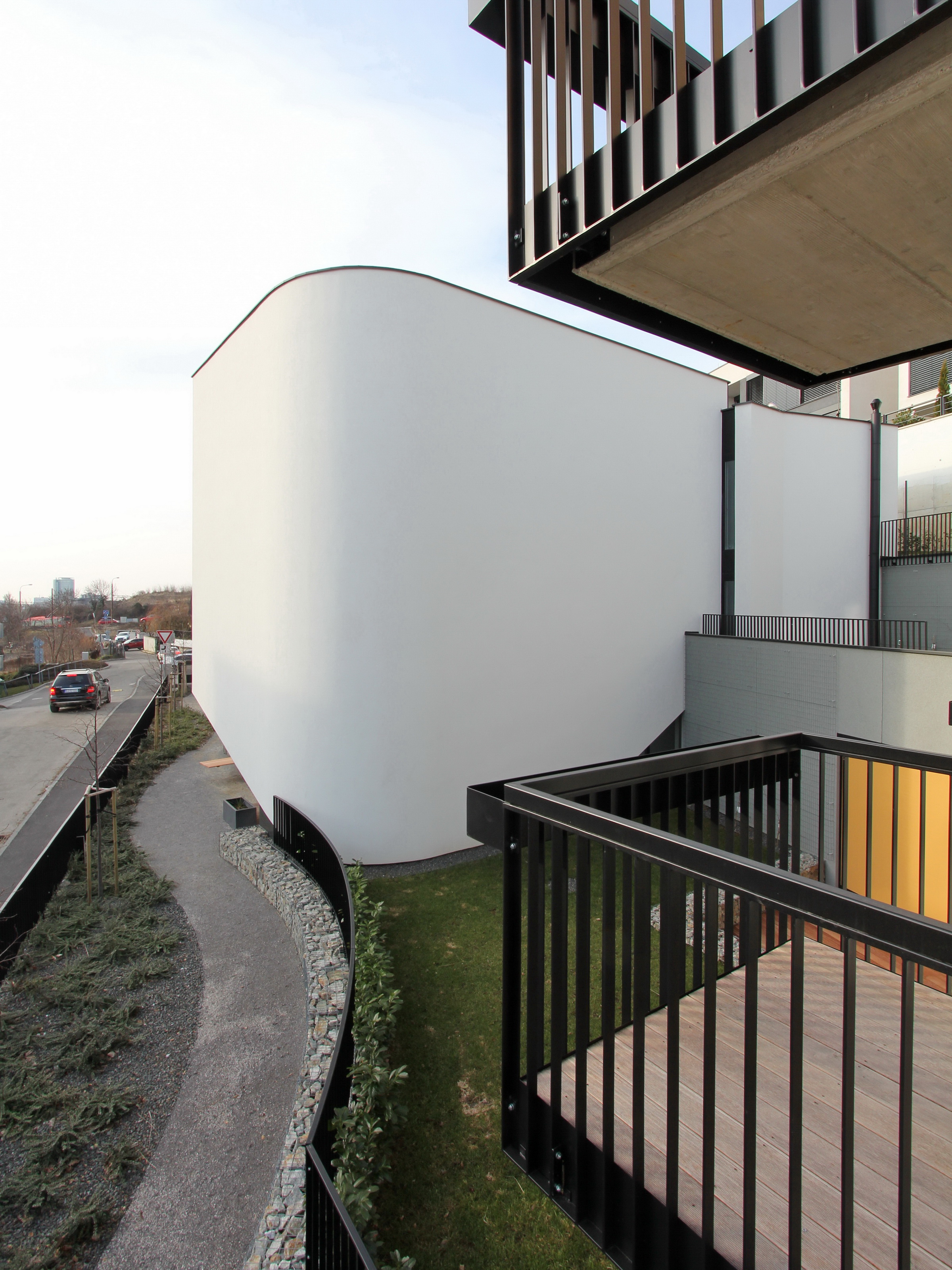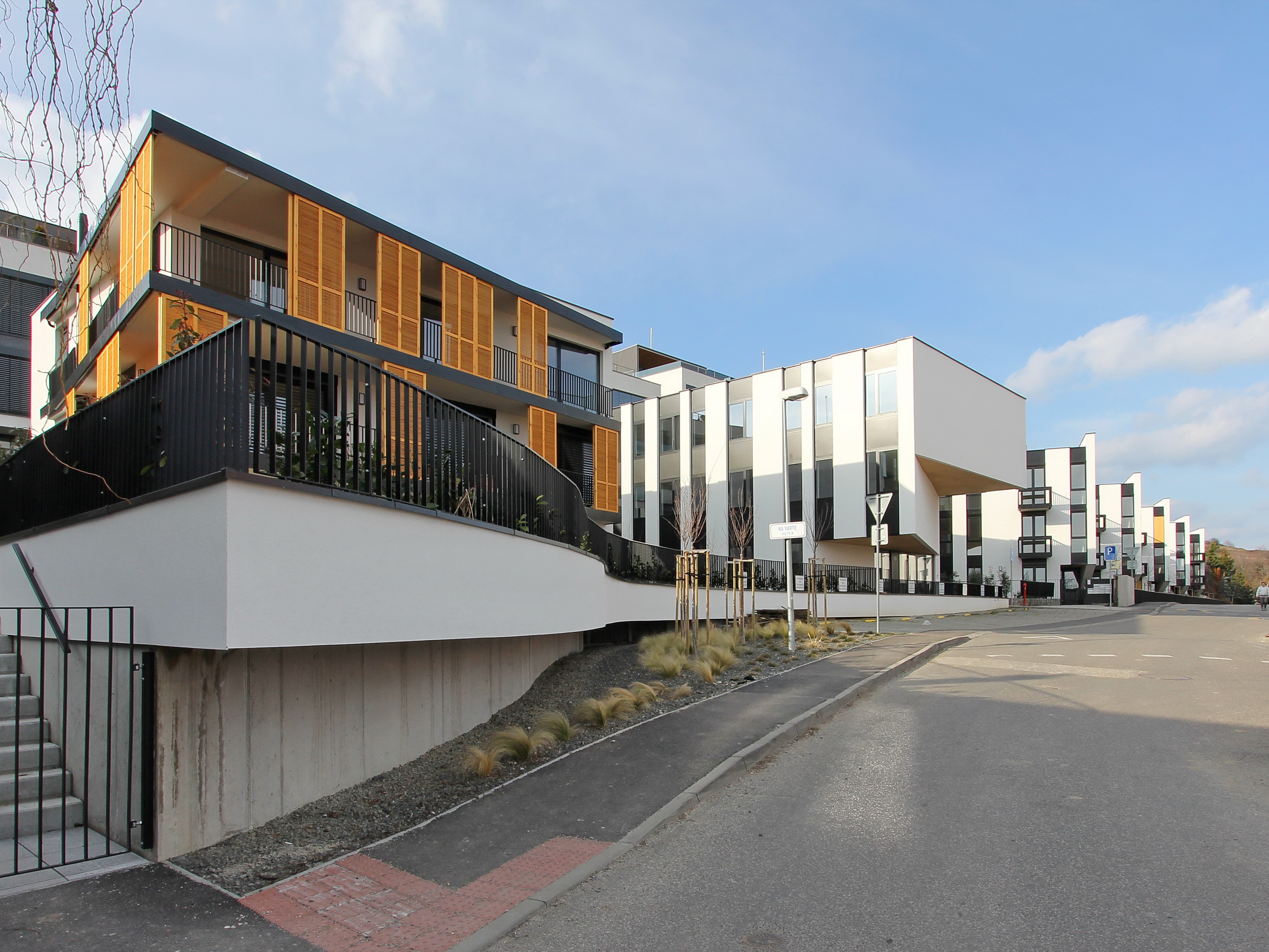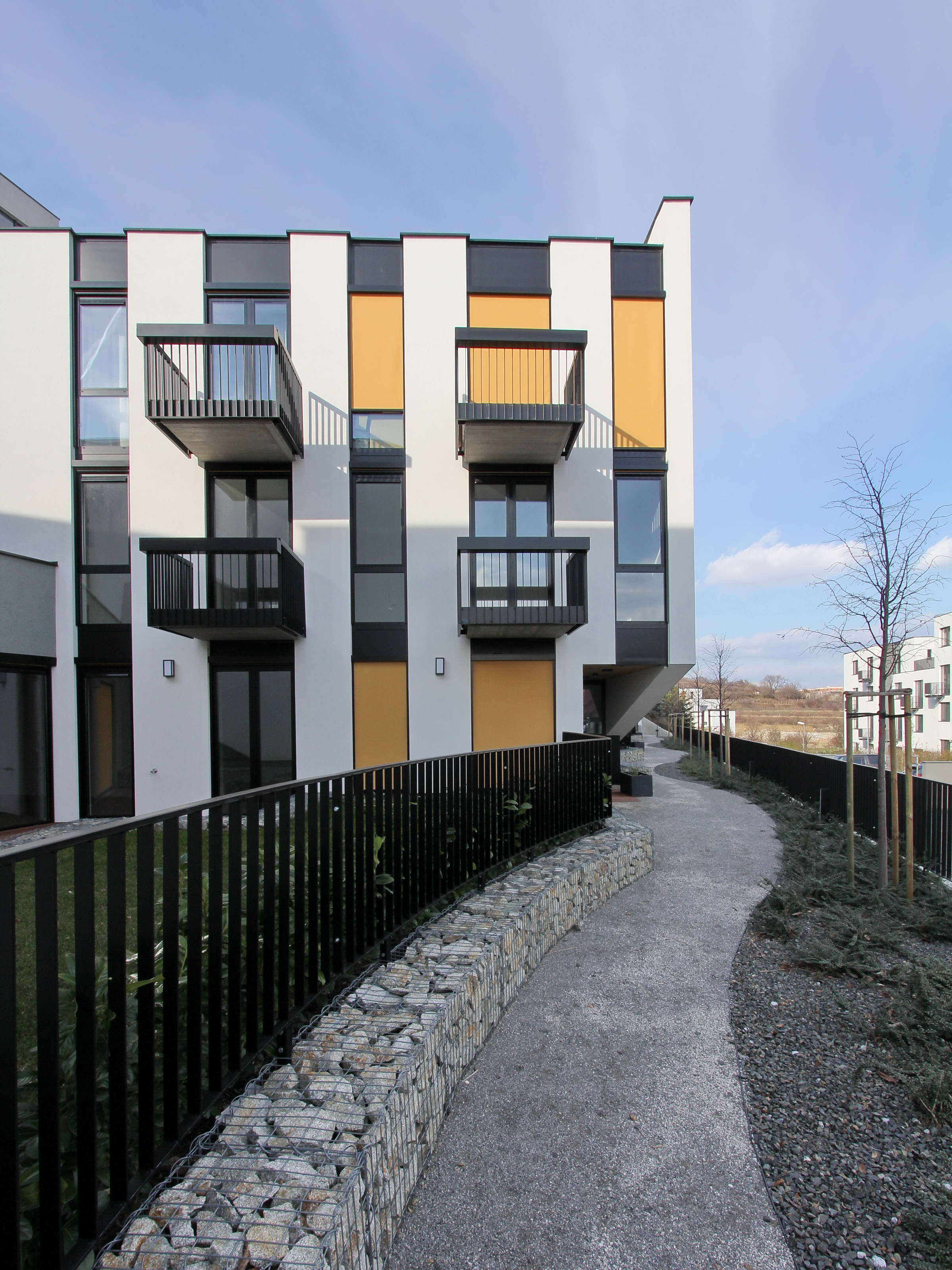Architektonické stvárnenie jednoduchých línii dopĺňa oblúk plnej fasády v nároží vždy od susedného objektu, odľahčený v spodnej časti odsadením od terénu. Zaoblenie fasády splnilo funkciu lepšieho preslnenia a presvetlenia priestoru záhrad medzi