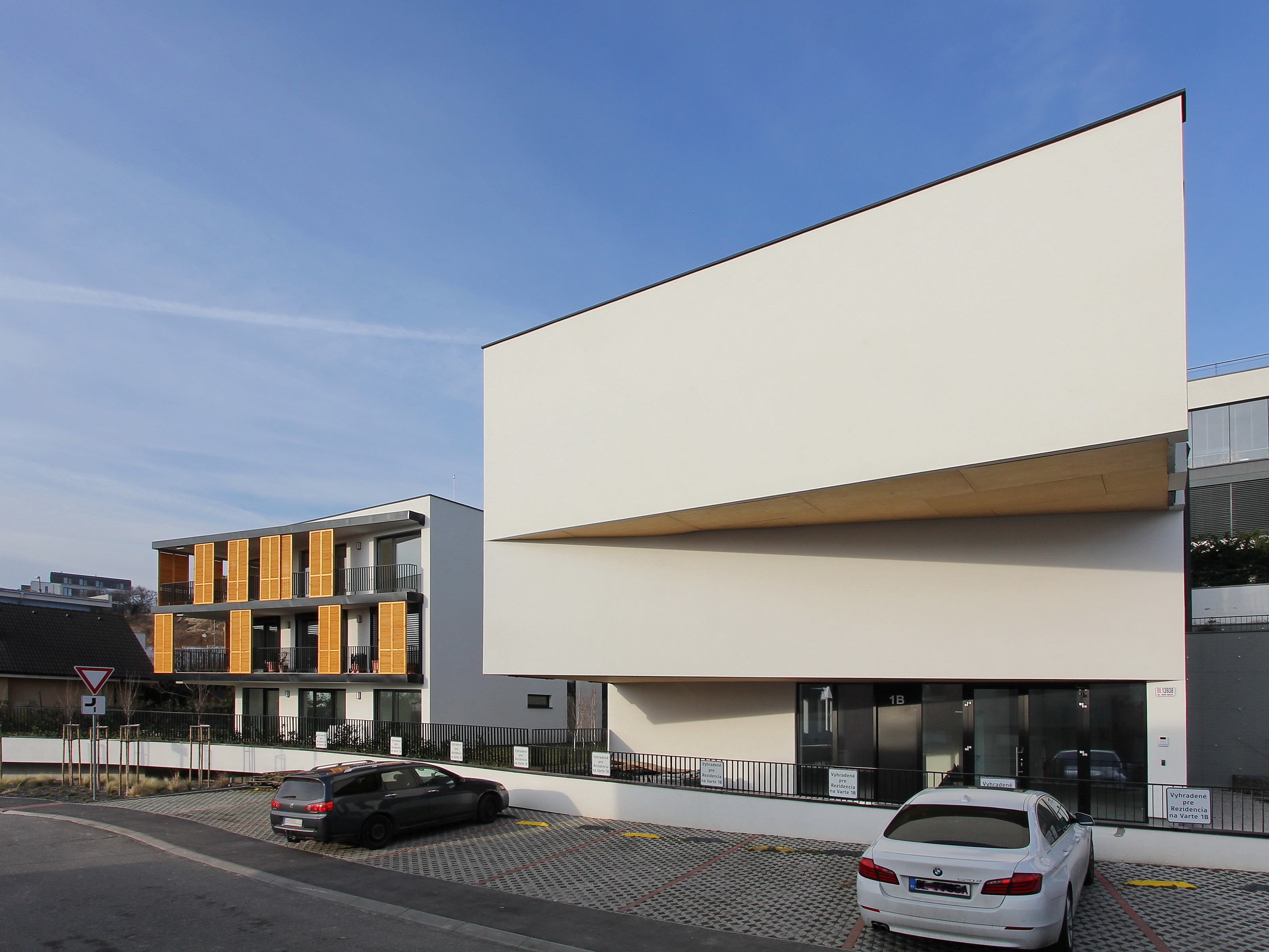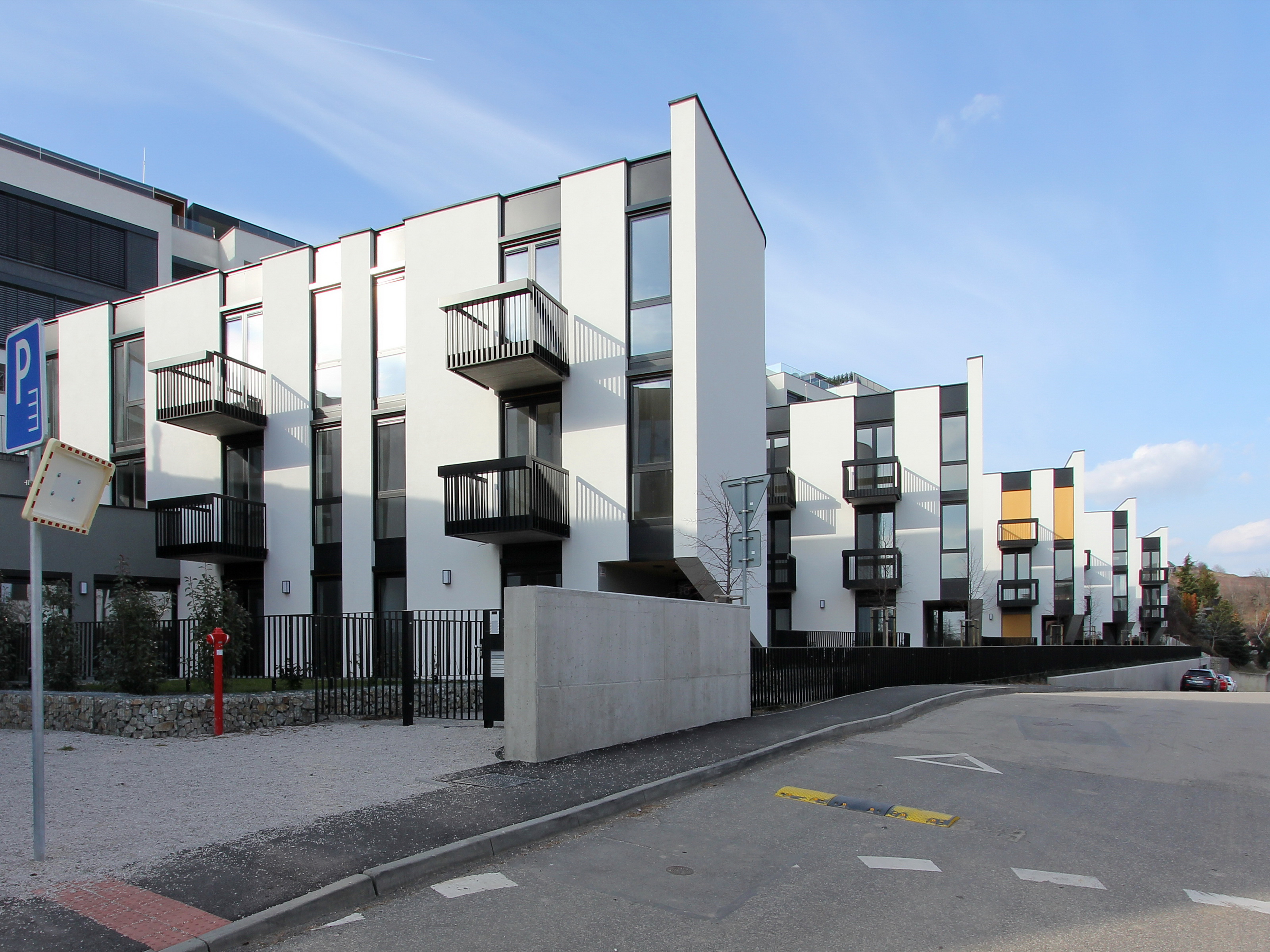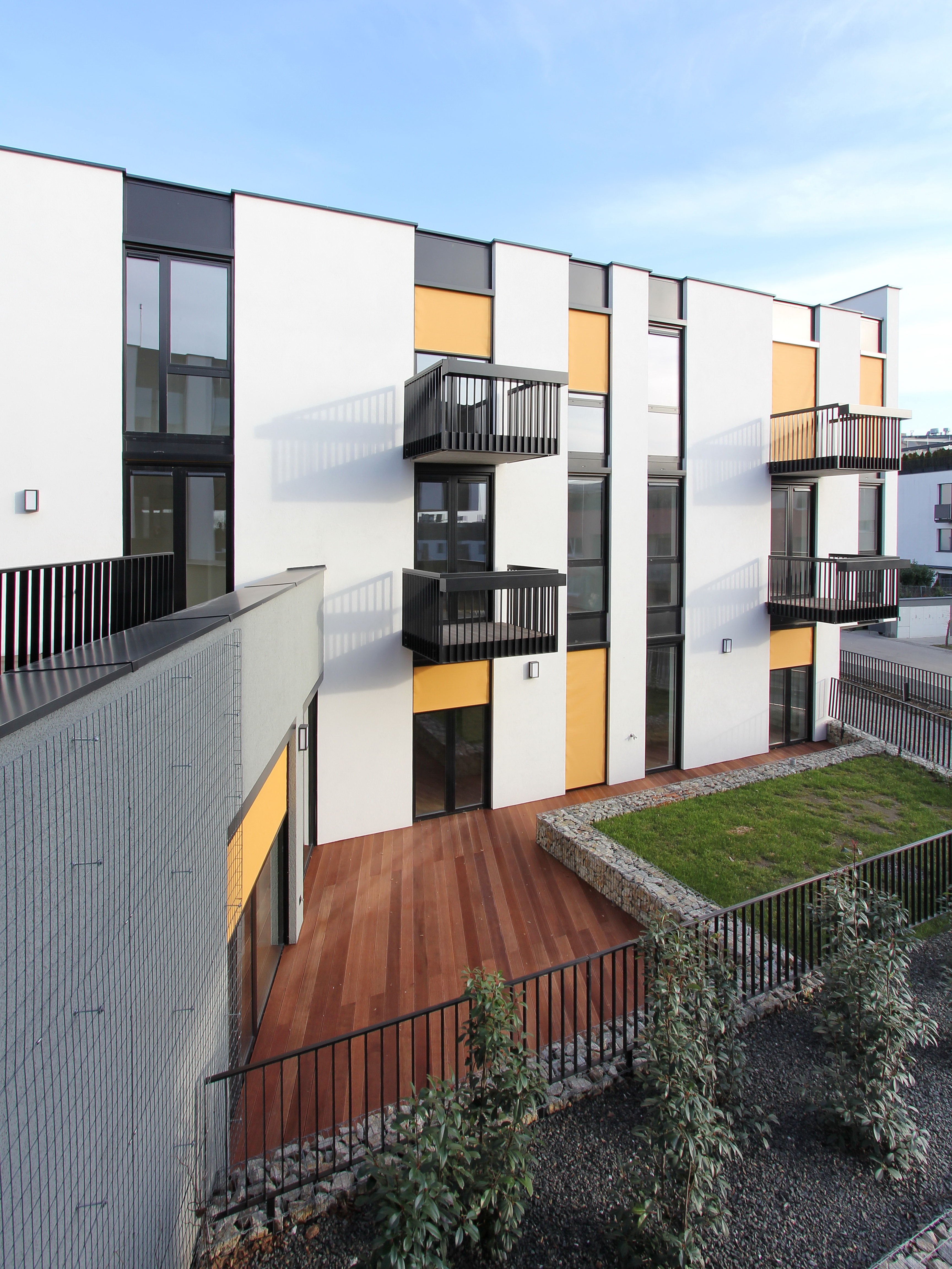 Architektonické stvárnenie jednoduchých línii dopĺňa oblúk plnej fasády v nároží vždy od susedného objektu, odľahčený v spodnej časti odsadením od terénu. Zaoblenie fasády splnilo funkciu lepšieho preslnenia a presvetlenia priestoru záhrad medzi